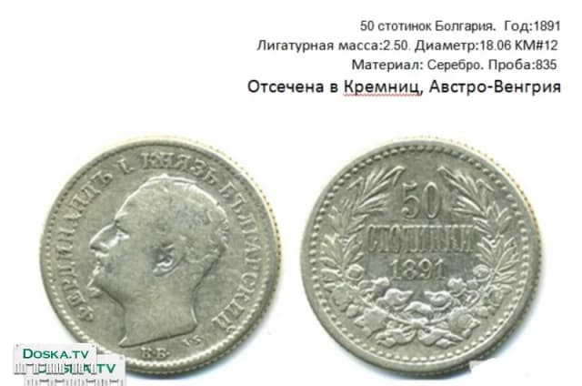 50 стотинок.Серебро,Проба:835.Княжество Болгария.Год:1891 KM#12 Лигатурная масса:2.50. Диаметр:18.06 Отчеканена в Кремниц,