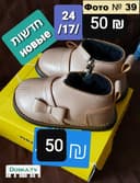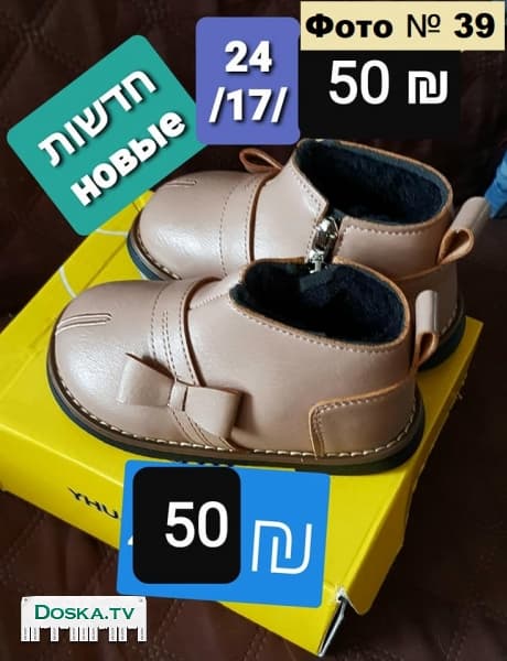 Детская обувь от размера 0+ до 37-го размера. Цена и размер написаны на каждой фотографии. Любая пара в единственном экземпляре. Есть Кроссовки, Туфельки, Ботинки, Сапожки, Пинетки, Первые шаги, Носки, Сандалики, Шлепанцы. Обувь для мальчика. Обувь для девочки. Теплая и Резиновая от дождя. Летная обувь. Встречу на остановке метронит в Крайот, на станции поезда “Моцкин”