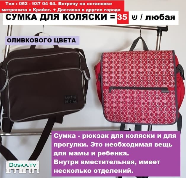 Сумка - Рюкзак на коляску или для пешей прогулки - незаменимая вещь для мамы и ребёнка; имеет несколько отделений, вместительная внутри. Есть 2-а разных по цвету экземпляра. Состояние : как новое. Цена = 35 ש / каждая. Крайот - Хайфа. + Доставка в другие города.
