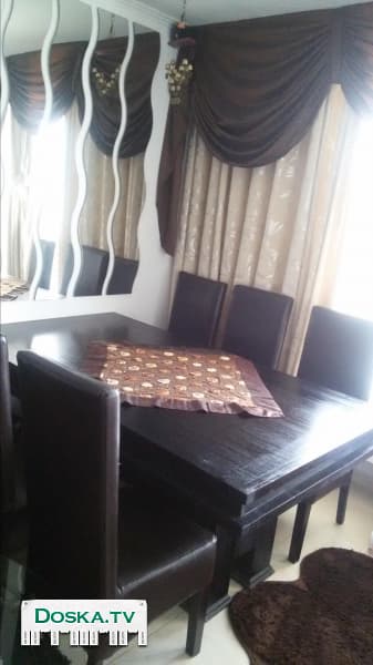 Темно-коричневый стол длинна1.80 см. ширина 1м. Раскладывает 2.50 м.и 6 стульев кож.зам.