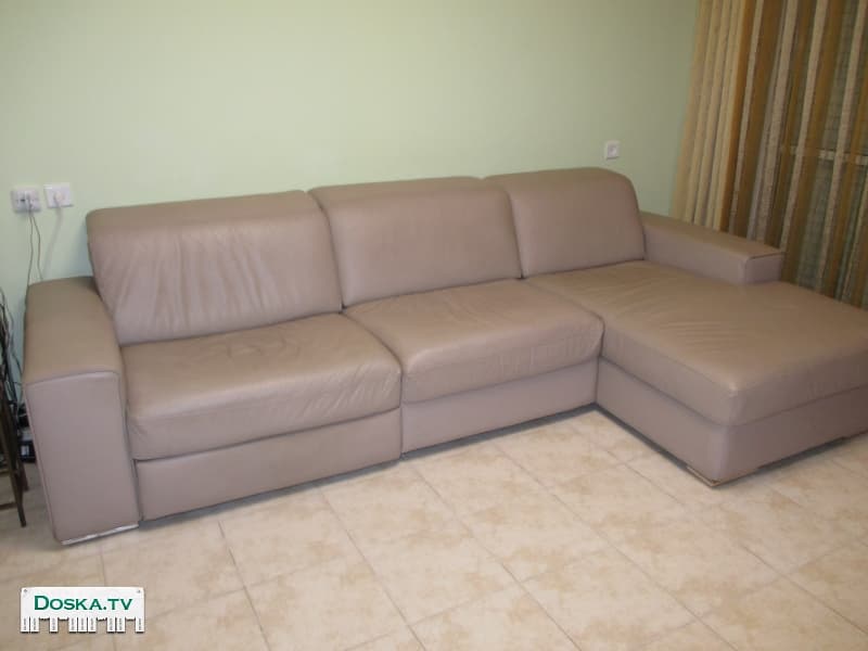 Итальянский угловой салон из натуральной кожи с левой стороны с шезлонгом ,с правой стороны с реклайнером, общая длина 280 см цвет Капучино, Сидушка с реклайнером раскладывается до лежачего положения, подголовники регулируются