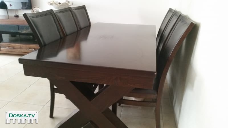 Стол и шесть стульев, натур дерево, темно коричневый цвет, обивка