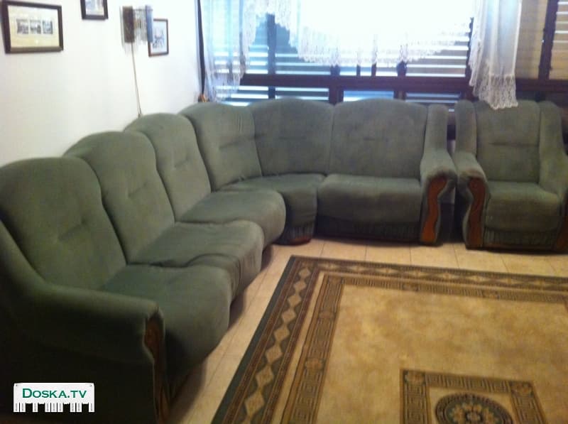 Угловой диван + кресло: велюровая ткань болотного цвета,раскладывается в двухспальную кровать, по всему периметру ящики для хранения, размер угла 3 на 2 м. + кресло производства Польша