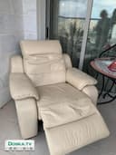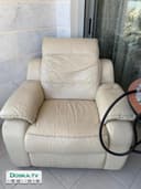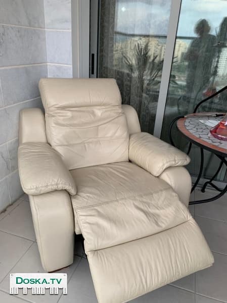 Удобное кожаное кресло, молочно-кремового цвета. С регулировкой подголовника и регулируемой подставкой под ноги.Отличное состояние!