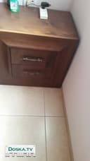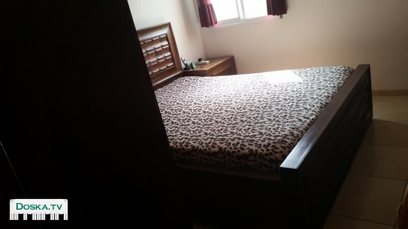 Двухспальная кровать с матрасом и две тумбочки, натур дерево, темно коричневый цвет.