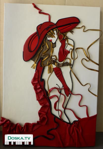 Объемная картина из натуральной кожи "Девушка в красном".