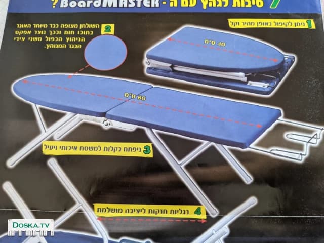 Гладильная доска. Складывается в размеры 30 x 40 см. Компактная. В развёрнутом состоянии размеры 30 x 80 см плюс место для утюга. Вес гладильной доски 2,5 кг.