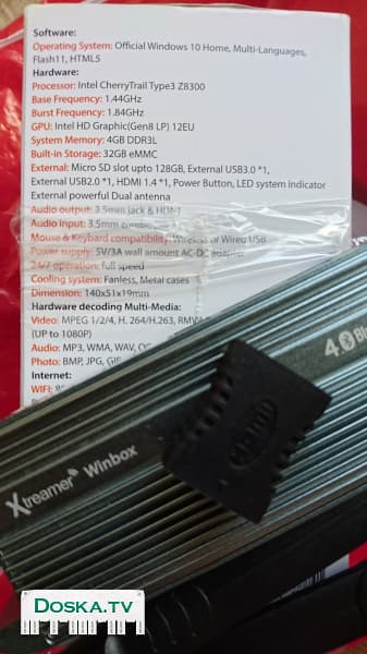 Мини компьютер операционная Система: Официальный Windows 10 Home, Несколькими Языками, Flash11 HTML5 Bios: Нормальный или Автоматического Включения Ubuntu дополнительно оборудование: процессор: Intel CherryTrail Type3 Z8300 базовая Частота: 1.44 ГГц Частотная: 1.84 ГГц GPU: Intel HD Graphic (Gen8 LP) 12EU системная Память: 4 ГБ DDR3L встроенный хранения: 32 ГБ eMMC, внешняя: Micro SD слот до 128 ГБ внешний USB3.0 * 1 внешний USB2.0 * 1 HDMI 1.4*1 аудио выход: 3.5 мм jack & HDMI аудио вход: 3.5 мм комбинированный разъем мышь: Беспроводной или Проводной USB мышь клавиатура: беспроводная или Проводная клавиатура USB Кнопка питания * 1 СВЕТОДИОДНЫЙ индикатор система внешний мощный Двойной антенны питание: 5 В/3A стены сумму AC-DC адаптер 24/7 операция: полной скорости система охлаждения: Безвентиляторный Дизайн, металлические корпуса для бесшумного охлаждения размер: 140x51x19 мм аппаратное декодирование Multi-Media: видео: MPEG 1/2/4, H. 264/H.263, WMV, rm, RMVB, WMV/VC-1, MVC, AVS и т. д. до 1080 P) аудио: MP3, WMA, WAV, OGG, FLAC, ALAC, APE, AAC, AV-3, DTS фото: BMP, JPG, GIF, PNG интернет: WI-FI: 802.11ac/n/g/b (5 Г/2.4 Г Dual Band) Внешний мощный двойная антенна Bluetooth: BT4.0 Eternet: RJ45 100 М/10 М Ethernet содержание пакета: Xtreamer winbox (лицензионная windows 10 pre-installed) HDMI extender адаптер питания руководство по быстрой установке гарантия до января 2018 (BUG)