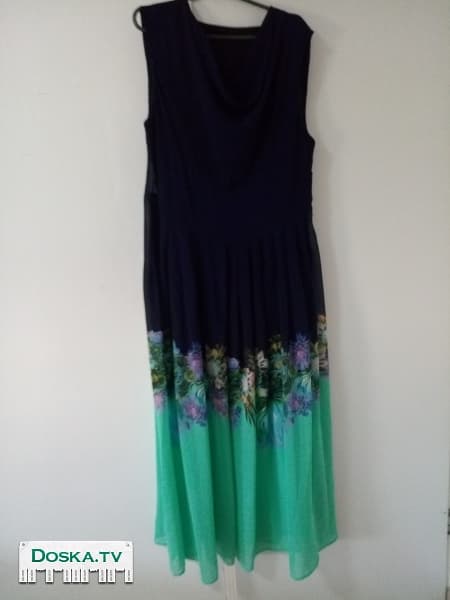 Платье вечернее, длинное из шифона. На рост 165 по щиколотку. Материал очень нежный и красивый, верх темно синий переходит книзу в бирюзовый с синими цветами. Большой размер. Одевалось один раз на день рождение