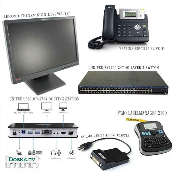 Продаются различные б/у компьютерные комплектующие, новые IP телефоны и другое оборудование. Все в прекрасном состоянии. Для деталей пишите на имейл или смс на телефон . Самовывоз из Тель-Авива (доставка обсуждается) Свитч гигабитный Juniper EX2200-24T-4G Layer 3 Switch "Управляемый коммутатор (свитч, свич, комутатор) Juniper EX2200 - EX2200-24T-4G с возможностью установки в стойку. Количество портов коммутатора: 24 x Ethernet 10/100/1000 Мбит/сек. Внутренняя пропускная способность 56 Гбит/сек Размер таблицы MAC адресов 8192. Auto MDI/MDIX, IEEE 802.1p (Priority tags), IEEE 802.1q (VLAN). Telnet, SMTP" Док-станция Unitek USB3.0 Y-3704 (VGA/HDMI,Audio,Gigabit Ethernet,2-Port hub USB3.0) HDMI + VGA + Hub + Audio + RJ45, Поддерживает 1080P HDMI и 5.1-канальный выход Телефоны Yealink SIP-T21P E2 VOIP Phone with PoE, Backlight новые, в упаковках, не бывшие в употреблении, есть 2шт 2 SIP-аккаунта с независимой настройкой. Удержание, отключение микрофона, DND (не беспокоить). Быстрый набор, горячая линия. Переадресация, режим ожидания, трансфер. Групповое прослушивание, SIP SMS, экстренные вызовы. 3-х сторонняя конференция. Выбор мелодии/загрузка/удаление. Возможность питания по линии Ethernet (PoE). Имеется подсветка дисплея; Записная книжка на 1000 записей в 5 группах. Журнал последних вызовов на 100 номеров, Блокировка клавиатуры, Регулировка громкости, Черный список. Голосовые кодеки G.722, iLBC, DTMF, In-band, G.711a/u (64 Кбит/с), G.726, RFC2833, G.723.1, G.729AB. Настройка Yealink SIP-T21P E2 производится через Web-интерфейс, с клавиатуры через меню или удаленно Внешняя видеокарта ST Labs USB 2.0 to DVI Adapter, есть 2шт Данный адаптер позволяет подключить к USB-порту компьютера монитор высокого разрешения. Разъемы DVI-I, USB Type A "папа" Принтер для лейблов Dymo LabelManager 210D Электронный ленточный принтер LabelManager 210D, ленты D1 шириной 6, 9, 12 мм Label Manager 210D – профессиональный принтер для наклеек и этикеток, который применяется при работе в офисе, на производстве и предприятиях оптово-розничной торговли, c возможностью переключения языка одной кнопкой, большим экраном с возможностью видеть этикетку такой, какой она будет при печати. Питание от 6 батареек AA Монитор Lenovo ThinkVision L197wA 19" Widescreen LCD Monitor DVI/VGA ЖК-монитор с диагональю TFT TN матрицы размером 19", поддерживает разрешение 1440x900 (16:10), подключение: VGA, DVI, контрастность 1000:1, время отклика 5 мс
