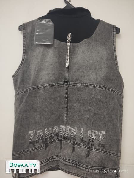 Размер S жилет из джинса серого цвета с аксессуарами, брюки 100% хлопка Новый Продаю из за надобности из за большого мне размера