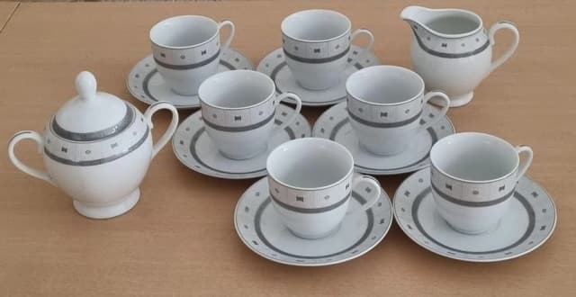 винтажный кофейный сервиз на 6 персон из белого тонкого фарфора с серебристым декором, изготовленный мануфактурой Victoria Porcelain(Чехословакия/Чехия)