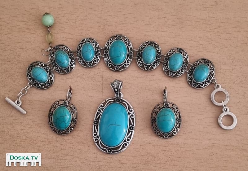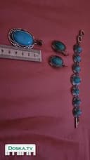 Комплект под серебро и бирюзу (браслет, серьги и кулон)