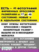 Кроссовки фирменные. Каждая пара имеет свой конкретный размер, фирму, цену, которые написаны на каждой фотографии. Кроме представленных нескольких фотографий есть ещё больше 30 фотографий кроссовок в размерах от 17 до 46 > кому надо > напишите КОНКРЕТНЫЙ размер / ы > вышлю эти фотографии на Вашу электронную почту ( мой E-mail : now4@yandex.ru ). Состояние кроссовок : новые и в идеальном состоянии. * Есть Футбольные кроссовки : размеры 43, 40. * Есть Детская Обувь от 0+ до 37 размера > запросите > вышлю фотографии на Вашу электронную почту. * Встречу на остановке метронит / автобуса в центре Кирьят Ям или тахана ракевет "Моцкин". + Доставка в другие города.