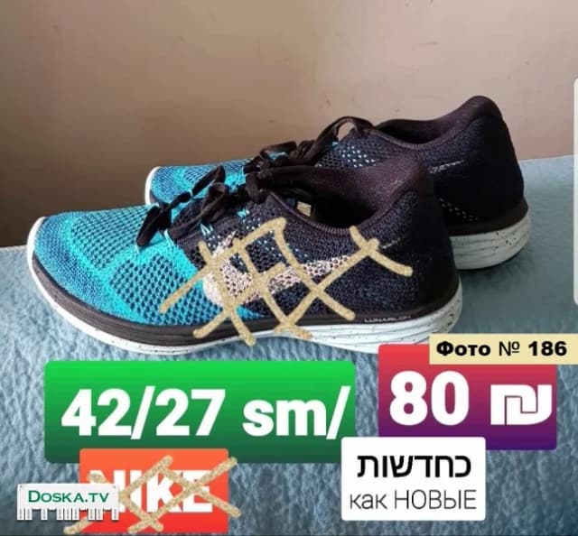 Кроссовки фирменные. Каждая пара имеет свой конкретный размер, фирму, цену, которые написаны на каждой фотографии. Кроме представленных нескольких фотографий есть ещё больше 30 фотографий кроссовок в размерах от 17 до 46 > кому надо > напишите КОНКРЕТНЫЙ размер / ы > вышлю эти фотографии на Вашу электронную почту ( мой E-mail : now4@yandex.ru ). Состояние кроссовок : новые и в идеальном состоянии. * Есть Футбольные кроссовки : размеры 43, 40. * Есть Детская Обувь от 0+ до 37 размера > запросите > вышлю фотографии на Вашу электронную почту. * Встречу на остановке метронит / автобуса в центре Кирьят Ям или тахана ракевет "Моцкин". + Доставка в другие города.