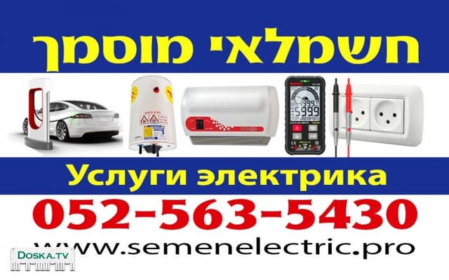 КВАЛИФИЦИРОВАННЫЙ ЭЛЕКТРИК (мусмах, ришайон хашмаль с 1994 г.) в Центре страны. Качественно и с гарантией! Приемлемые цены! - подготовка к проверке и подключению к Хеврат Хашмаль (Электрической Компании Израиля) - подключение к сети зарядной станции для электромобиля - установка и перенос розеток, дополнительных точек, светильников и выключателей - ремонт и замена бойлеров и атморов - замена электропроводки и эл. щитов, устранение неисправностей - установка кронштейнов ТВ, подключение стиральных и посудомоечных машин, нагревателей, ремонт эл. трис - проектирование и исполнение эл. технических работ при ремонте квартиры и многое другое... Районы: Холон, Бат Ям, Ришон ле Цион, Тель Авив, Рамле, Лод, Реховот, Ашдод, Ашкелон (весь Центр страны). Семён (Tel, WhatsApp) Добро пожаловать на сайт