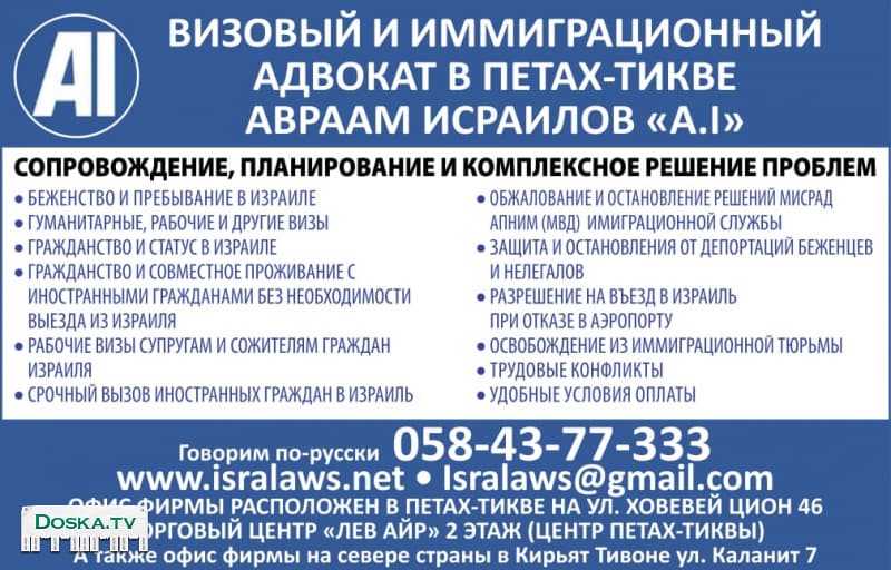 ВИЗОВЫЙ И ИММИГРАЦИОННЫЙ АДВОКАТ В ИЗРАИЛЕ Сопровождение, планирование и комплексное решение проблем 1. Беженство, Гуманитарные, и другие визы 2. Временное разрешение на пребывание в Израиле за 48 часов 3. Гражданство и статус в Израиле лицам, имеющим право на репатриацию 4. Гражданство и совместное проживание с иностранными гражданами 5. Рабочие визы супругам, сожителям граждан Израиля 6. Вызов иностранных граждан в Израиль 7. Обжалование решений Мисрад Апним (МВД ИЗРАИЛЯ) 8. Защита и остановка от депортации беженцев и нелегалов за 48 часов 9. Разрешение на въезд в Израиль при отказе в аэропорту 10. Освобождение из иммиграционной тюрьмы Офис расположен в Петах-Тикве ул.Ховвей Цион ПОДРОБНУЮ ИНФОРМАЦИЮ МОЖНО НАЙТИ НА НАШЕМ САЙТЕ.