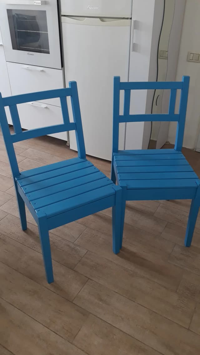 Полностью обновленные два деревянных стула. Сиденье из нового дерева. Перед покраской обработаны горячим паром и спиртом. Экологичная краска