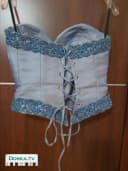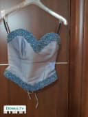 Очень красивый наряд - юбка клеш и топ оттороченный разноцветными камнями. ткань плотный шелк - с переливами цветов нежно-голубым и серым. можно использовать в виде свадебного наряда. размер 36-38