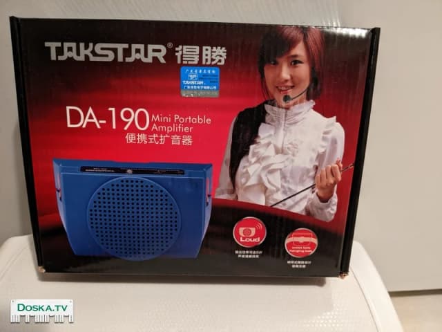 Портативный аудио усилитель. Питание от 6 батареек АА. Есть поясной ремень. Частотный диапазон: 70Гц-12кГц. Выходная мощность 5Вт. Время работы до 6 часов при полной нагрузке.