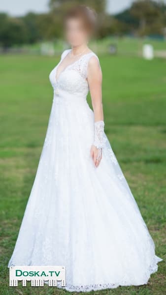 Продаю очень красивое свадебное платье по очень низкой цене. Качество отличное, кружевные узоры, очень удобный корсет, завязка сзади. Размер S-M, на рост от 164 и выше, с каблуками. Прилагается чехол. *Цена включает платье+чехол+шубка белого цвета+фата.