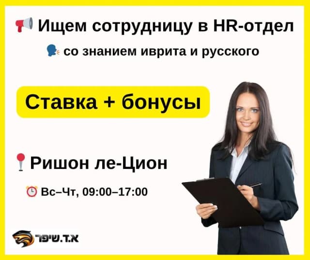 📢 В логистическую компанию требуется Специалист по подбору персонала Ищем энергичную и коммуникабельную девушку для работы в HR-отделе 💼 Что предлагаем: ✔ Ставка + бонусы за результат 📅 График: вс–чт, 09:00–17:00 🏢 Работа в офисе в Ришон-ле-Ционе 🌐 Разговорный русский и иврит — обязательно