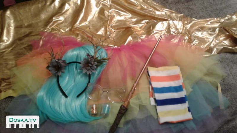 Кто хочет быть феей на Пурим? Золотой плащ с капюшоном, радужная фатиновая юбка, цветные чулки, шикарный бирюзовый парик (длинное каре), лесные рожки, волшебная палочка, очки и две баночки блесток в тон. Все отдам за 150 шекелей. Отвечаю на звонки после 16:00.