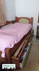 Подростковая кровать из дерева с выдвижной нижней кроватью и 2-мя ящиками. Цвет шита, отделка зеленым.