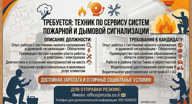 ОПИСАНИЕ ДОЛЖНОСТИ: Опыт работы с системами низкого напряжения и дымовой сигнализации – Обязателен Преимущество при наличии опыта работы в электрике / электронике Диагностика и устранение неисправностей на месте Оказание профессиональных и вежливых услуг клиентам ТРЕБОВАНИЯ К КАНДИДАТУ: Опыт работы с системами низкого напряжения и дымовой сигнализации – Обязателен Преимущество при наличии образования в области электрики / электроники Работа в районе Петах-Тиква и окрестностей Водительское удостоверение категории В Водительское удостоверение категории А1 / А2 ДОСТОЙНАЯ ЗАРПЛАТА И ОТЛИЧНЫЕ СОЦИАЛЬНЫЕ УСЛОВИЯ! ДЛЯ ОТПРАВКИ РЕЗЮМЕ: Имейл: office@mzda.co.il Или звоните по телефон для дополнительной информации.