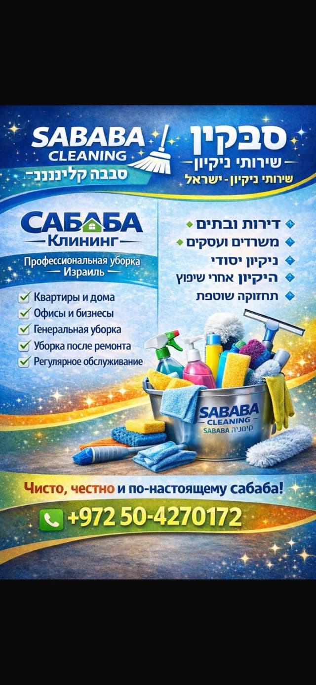 Надоела грязь? Мы сделаем сабаба! ✨ 🧼 Квартиры и дома 🛠 Уборка после ремонта 🔁 Регулярное обслуживание Работаем аккуратно и честно 📲 Звоните: +972 50-427-0172 SABABA CLEANING