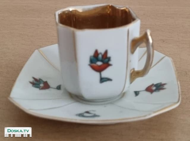 миниатюрная кофейная чашка и блюдце с восьмиугольными гранями и позолотой.